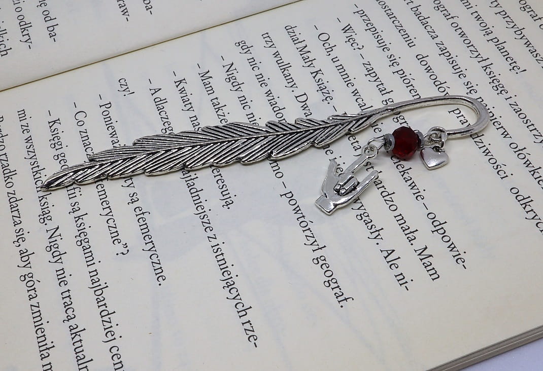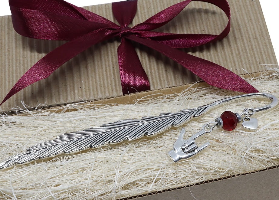 Zakładka do książki to nie tylko praktyczny przedmiot, ale również piękny drobiazg, który może być ozdobą samą w sobie. Metalowe pióro, którego ozdobą jest ręka przedstawiająca znak migowy "kocham cię", to wyjątkowy i symboliczny dodatek. Kryształek i małe serduszko dodają jej subtelności i uroku. Całość zapakowana jest w pudełko z siankiem i kokardką, co czyni ją idealnym prezentem dla ukochanej osoby.
