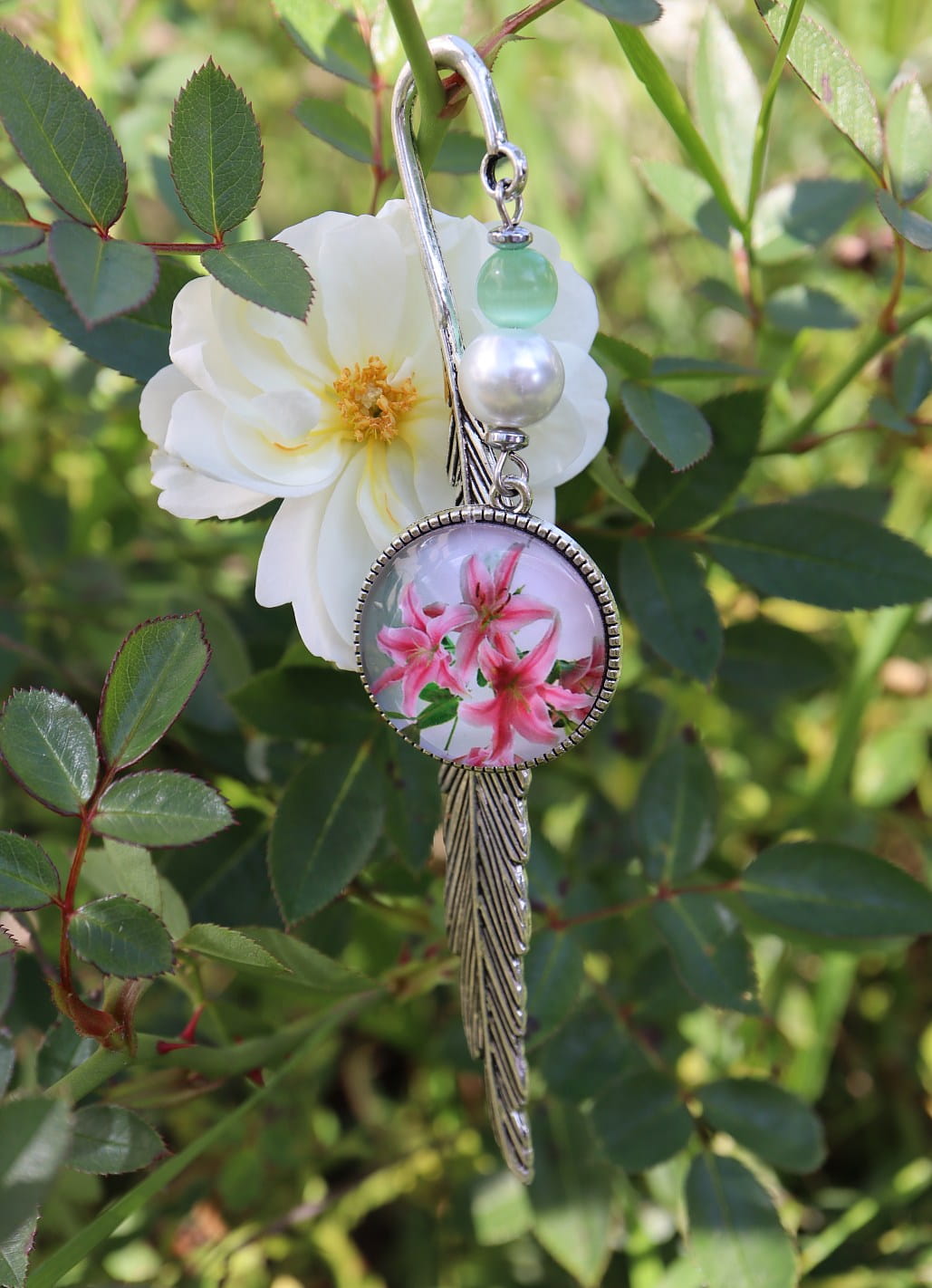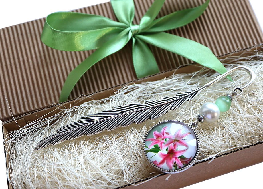 Zakładka do książki, kalendarza, notesu z pięknymi liliami, perełą i kamieniem kocie oko.