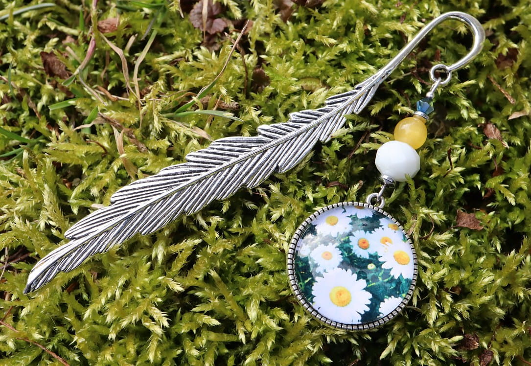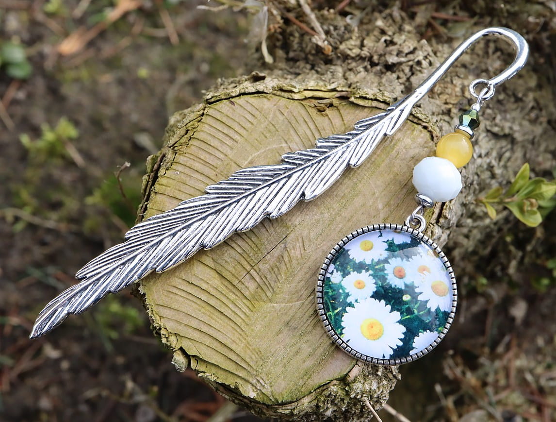 Zakładka do książki, kalendarza, notesu z piękną ozdobą w postaci eleganckiego kaboszonu na którym widnieją piękne rumianki.