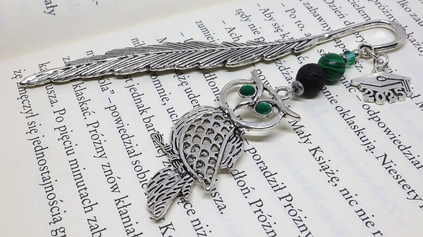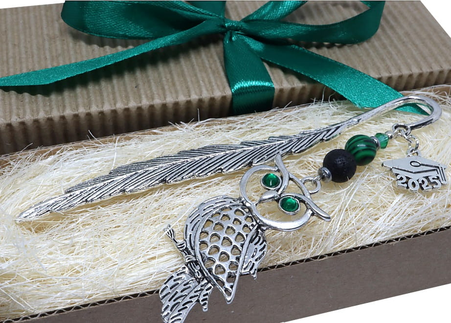 Ozdobą zakładki jest urocza sowa na gałązce, oraz biret z rokiem 2025 (lub 2026 - prosimy o informację przy zakupie.
