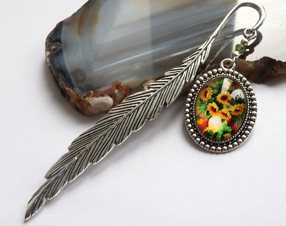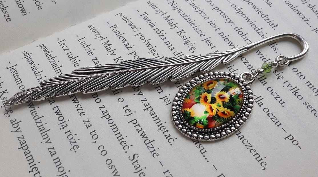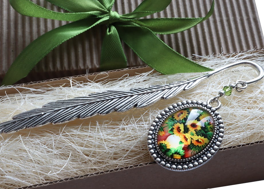 Zakładka do książki, kalendarza, notesu z piękną ozdobą w postaci szklanego kaboszonu ze słonecznikami.