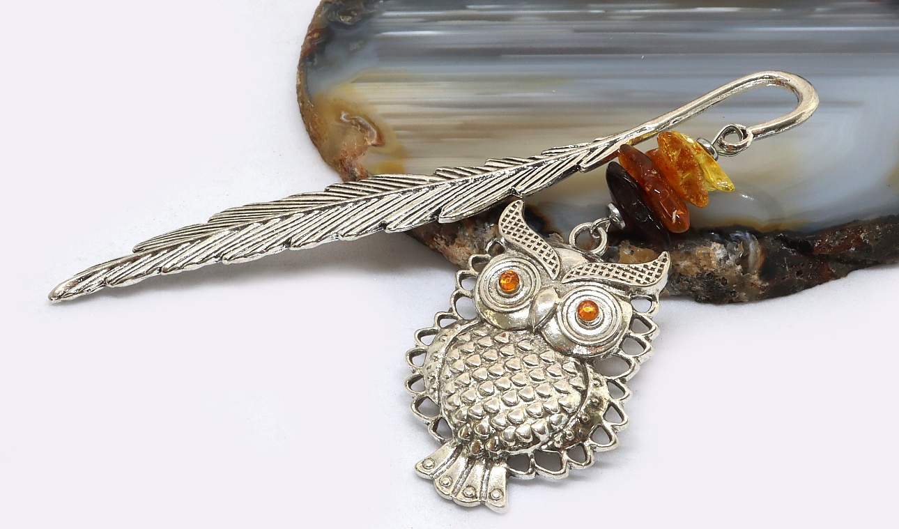 Metalowe pióro wiedzy – Zakładka z mądrą sową i bałtyckim bursztynem