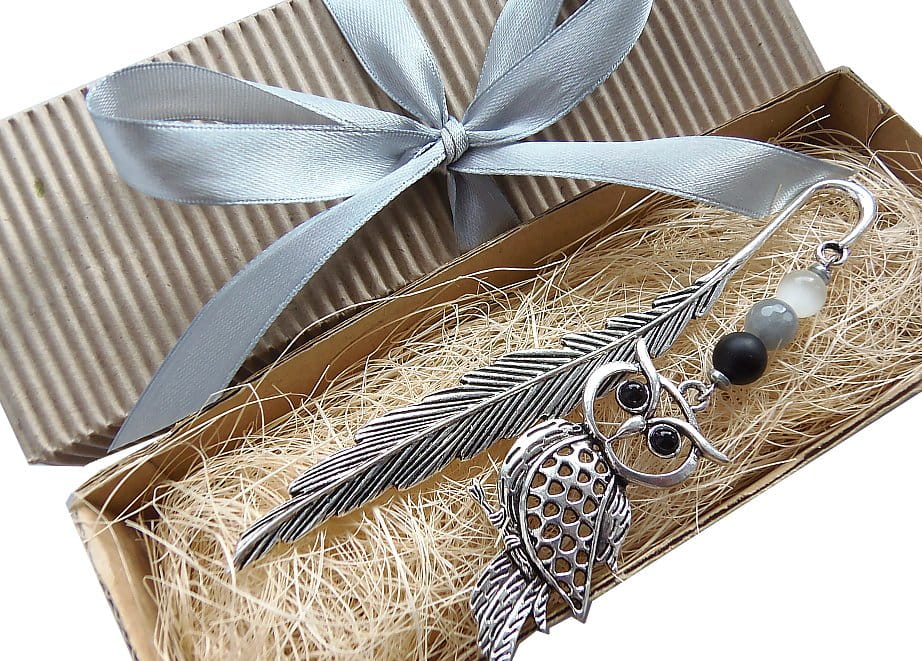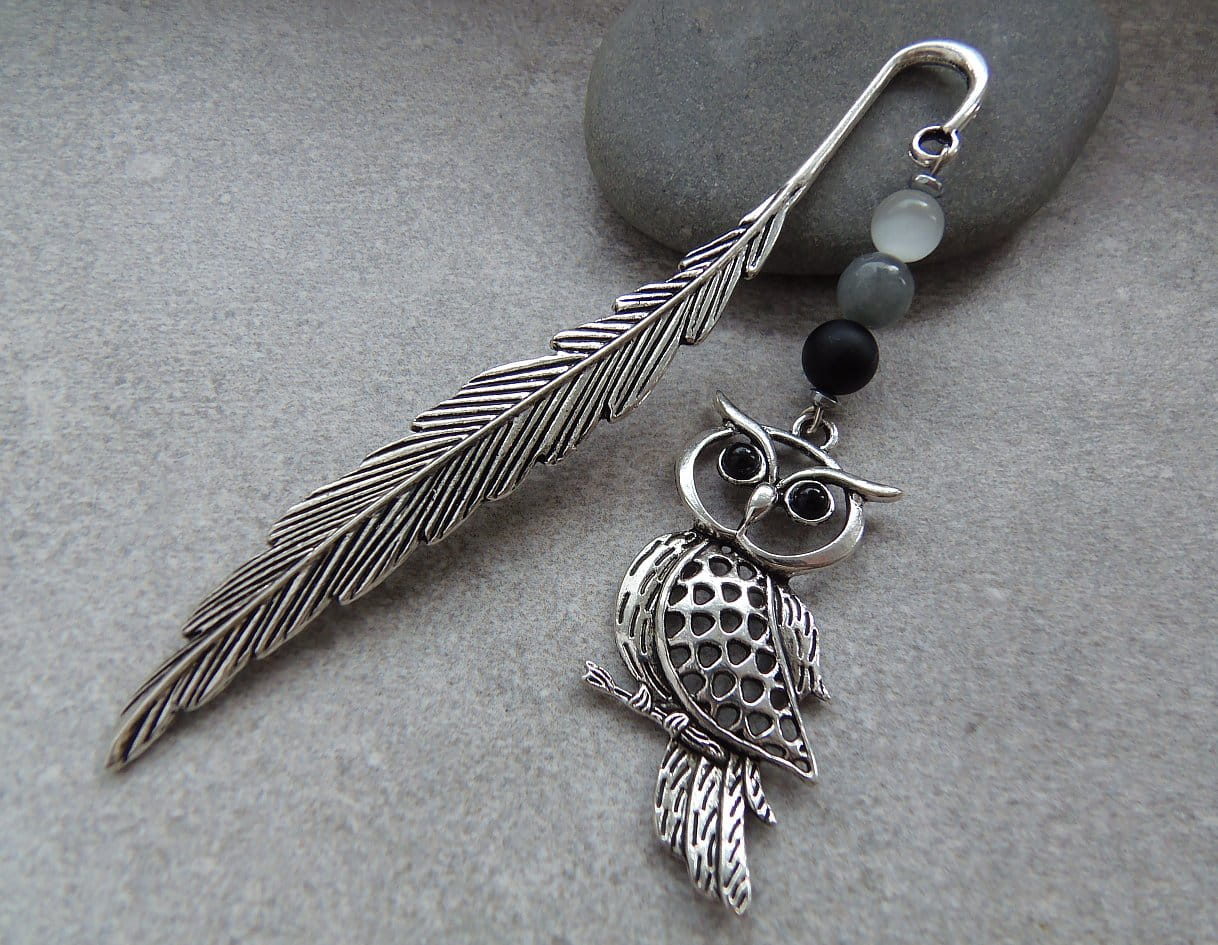 Zakładka do książki z ozdobną sową o czarnych, perłowych oczach, oraz z gustownymi kamieniami onyks, jadeit i kocie oko.