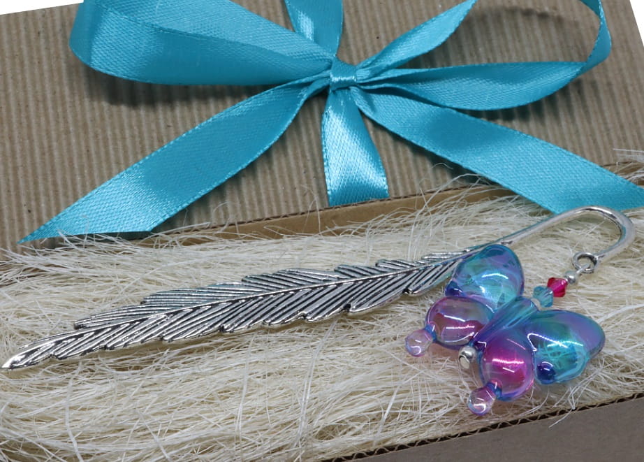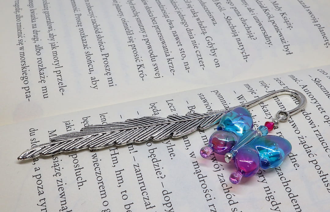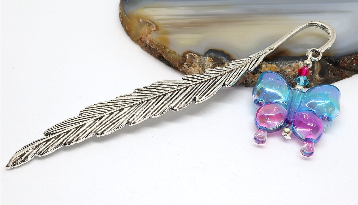 Zakładka to metalowe pióro o długości 12cm, którego ozdobą jest akrylowy motyl w tonacji turkusowo różowej.