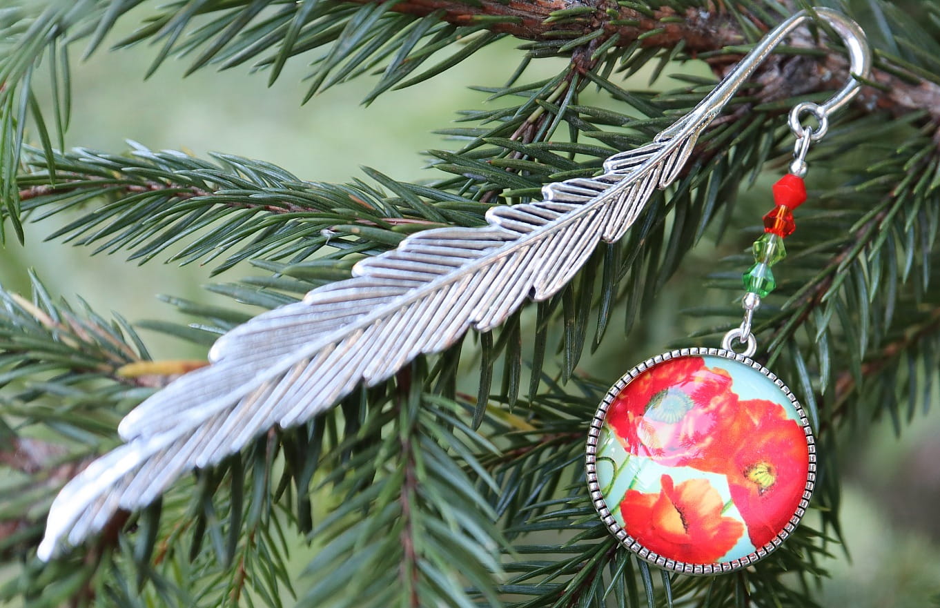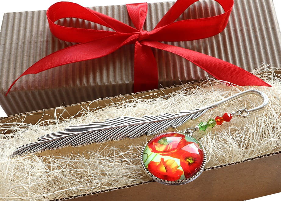 Zakładka do książki, kalendarza, notesu z pięknym, szklanym, kwiatowym kaboszonem, przedstawiającym polne maki.