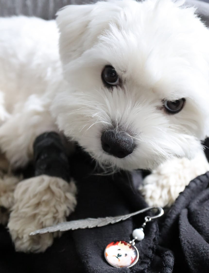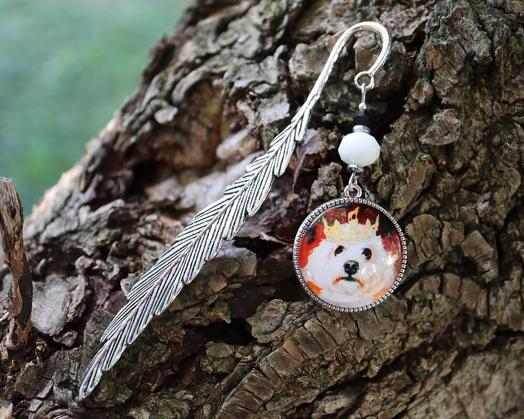 Zakładka do książki, kalendarza, notesu z pięknym, szklanym kaboszonem z psem maltańczykiem.