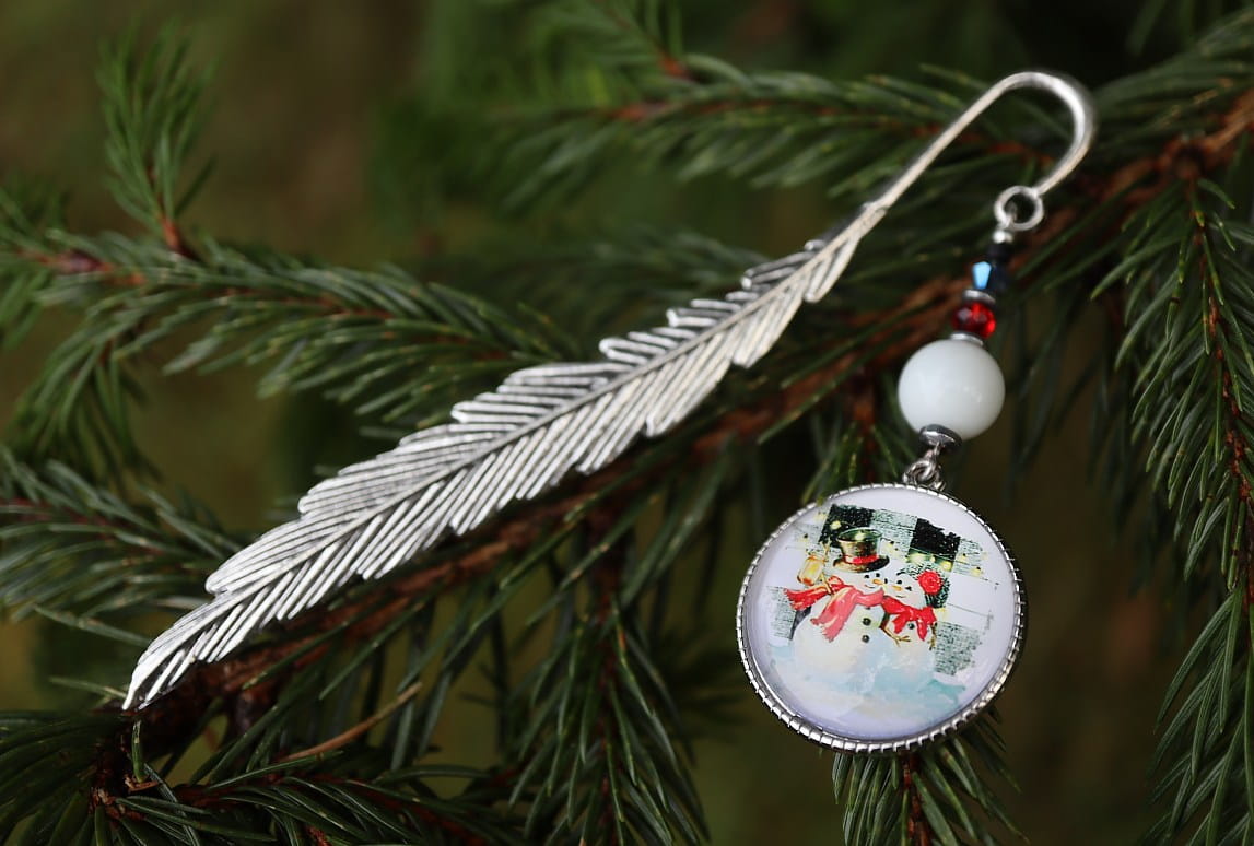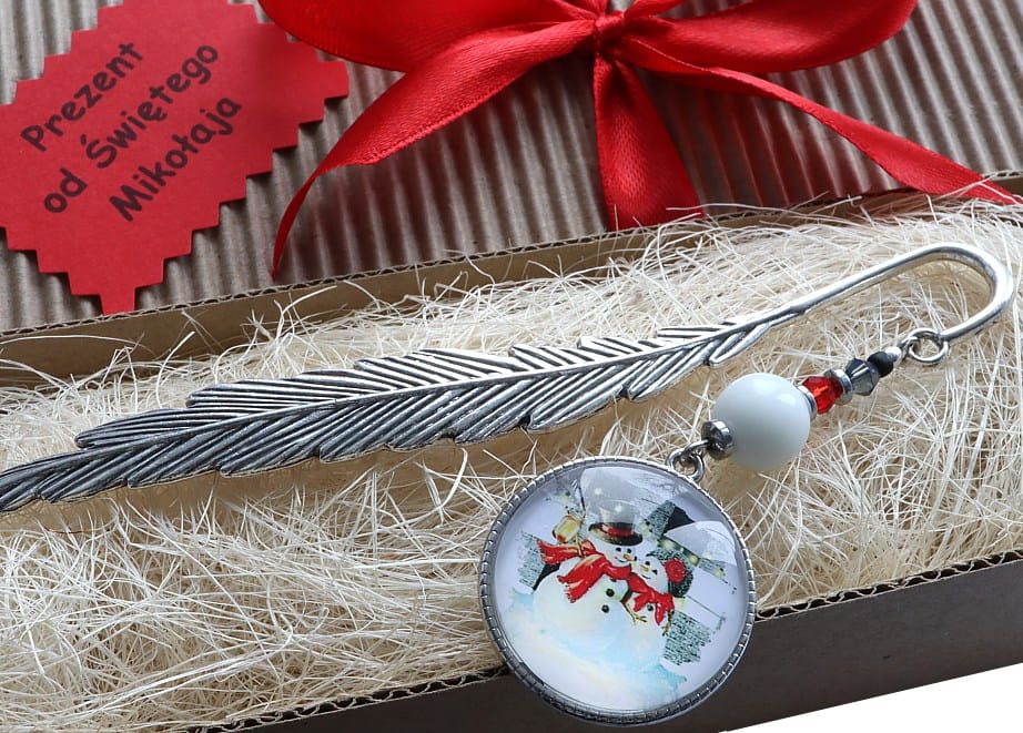 Zakładka do książki, kalendarza, notesu z piękną ozdobą w postaci świątecznych bałwanków z koralikami.