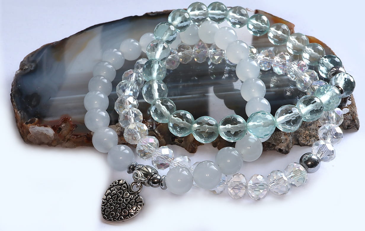 Zestaw trzech eleganckich, pastelowych bransoletek z kamieni: